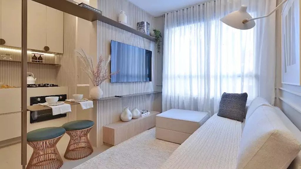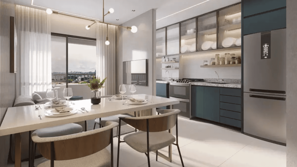 Quem valoriza área verde vai gostar do conceito do projeto. As áreas comuns integram vegetação ao lazer, com piscina, academia, espaço gourmet, kids e pet place. E um detalhe que consideramos um diferencial real: durante a obra, o morador pode escolher acabamentos, revestimentos e metais com o apoio de consultoria da própria incorporadora, o que é raro nessa faixa de empreendimento.